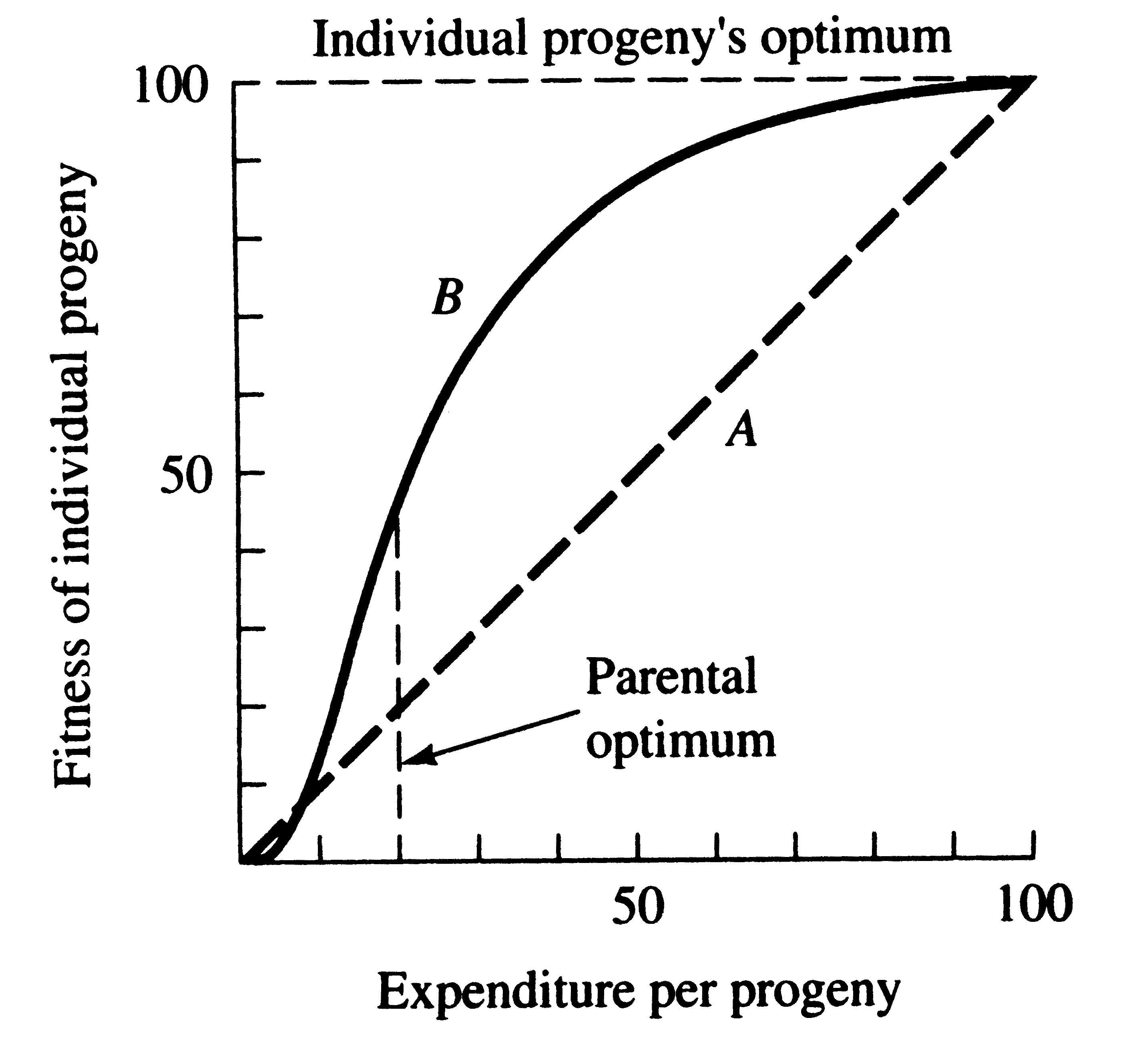 A simple graphical model illustrates this fundamental tradeoff between quantity and quality of offspring (Figures). In the unlikely event that progeny fitness increases linearly with parental expenditure (dashed line A in left Figure), fitness of individual progeny decreases with increased clutch or litter size (the lowermost dashed curve A in right Figure). However, because parental fitness (the total of the fitnesses of all progeny produced) is flat, no optimal clutch size exists from a parental viewpoint (upper dashed line A in right Figure). Gains in progeny fitness per unit of parental investment are likely to be greater at lower expenditures per progeny than at higher ones because the proportional increase per unit of allocation is greater at low levels of investment; curves level off at higher expenditures due to the law of diminishing returns. If the biologically plausible assumption is made that progeny fitness increases sigmoidally with parental investment (curve B in left Figure), there is an optimal parental clutch size (peak of uppermost curve B in right Figure). In this hypothetical example, parents that allocate only 20 percent of their reproductive effort to each of five offspring gain a higher total return on their investment than parents opting for any other clutch size (right Figure). Such curves have been demonstrated for starlings and swifts (Lack 1954) Although such a tactic is optimal for parents, it is not the optimum for individual offspring, which would achieve maximal fitness when parents invest everything in a single offspring. Hence, a "parent-offspring conflict" exists (Trivers 1974). The exact shape of the curve relating progeny fitness to parental expenditure in any real organism is influenced by a virtual plethora of environmental variables, including length of life, body size, survivorship of adults and juveniles, population density, and spatial and temporal patterns of resource availability. The competitive environment of immatures is likely to be of particular importance because larger, better-endowed offspring should usually enjoy higher survivorship and generally be better competitors than smaller ones. In addition to clutch size and female total investment in reproduction, the size (or weight) of an individual oviductal egg or newborn progeny, also varies widely among lizards from as little as 1-2% in some species to a full 17% in the live-bearing Kalahari fossorial skink Typhlosaurus gariepensis. Such expenditures per progeny are inverse measures of the extent to which a juvenile lizard must grow to reach adulthood. Clutch or Litter Size Juveniles and adults are often subjected to very different selective pressures. Reproductive effort should reflect environmental factors operating upon adults, whereas expenditure per progeny will be strongly influenced by juvenile environments. Because any two parties of the triumvirate determine the third, an optimal clutch or litter size is a direct consequence of an optimum current reproductive effort coupled with an optimal expenditure per progeny (indeed, clutch size is equal to reproductive effort divided by expenditure per progeny). Of course, clutch size can be directly affected by natural selection as well. For example, it has been suggested that all members of the lizard genus Anolis lay but a single egg because the ancestral stock was arboreal and encountered intense selection against being weighted down by a heavy egg load, becoming genetically fixed at a clutch size of one (Andrews and Rand 1974). Any two parties to this triad (clutch size, female reproductive investment, and expenditure per progeny) uniquely determine the third: however, forces of natural selection molding each differ substantially. Thus clutch or litter weight presumably reflects an adult female's best current investment tactic in a given environment at a particular instant in time whereas expenditure on any given individual progeny is probably more closely attuned to the average environment to be encountered by a juvenile. In a sense, then, clutch (or litter) size is the direct result of the interaction between an optimal parental reproductive tactic and an optimal juvenile body size (clutch size is simply the ratio of the former divided by the latter). Statistics on clutch/litter sizes, total reproductive investment of females, and expenditure per progeny among 65 species of desert lizards were presented by Pianka (1986), along with similar data on another 20 species of lizards, including both desert and non-desert forms extracted from the literature. Among the species surveyed, average clutch/litter size varies from 1 in the Kalahari skink Typhlosaurus gariepensis and the geckos Gehyra variegata and Ptenopus garrulus to 13 in the Kalahari agamid Agama aculeata. Clutch sizes in certain horned lizards are still larger, averaging 24.3 in the American iguanid Phrynosoma cornutum (the Texas horned lizard). Clutch or litter size and female investment are significantly positively correlated (r = .482, P < .001), although scatter is considerable. Viviparous species (mostly skinks) tend to have slightly higher investment ratios than do the egg layers. Since expenditure per progeny can be estimated from total investment divided by clutch/litter size, it tends to decrease exponentially with increasing number of progeny (for a fixed total investment). Expenditure per progeny and clutch/litter size are inversely related (r = -.652 P < .001). This correlation is strengthened when both variables are transformed to logarithms (on a log-log plot, the correlation coefficient is -.810). Clutch size is thus correlated positively with total investment but negatively with investment per progeny. In simple product-moment correlation, the latter two members of the triumvirate, total reproductive investment and expenditure per progeny, are only weakly and not significantly correlated (r = .153, P < .10), suggesting that these two parameters vary independ