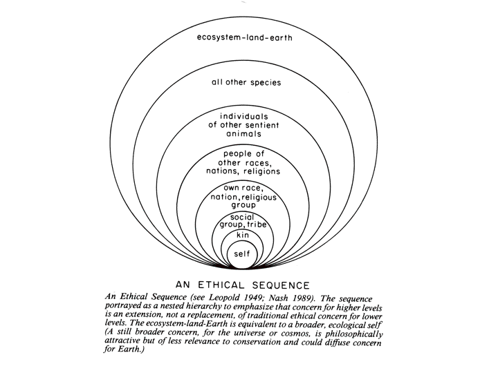 This figure shows an ethical sequence based on Aldo Leopold's ideas. Here you can see what you're really familiar with at the bottom: Your own selfish self -- you take care of your money, you take care of your possessions, and maybe you're a little bit altruistic towards your kids, brothers, sisters, uncles and aunts. If we went back 10,000 years to when we were still living in a cave, we'd have these little social groups -- tribes -- where everybody knew everybody, and we met in caves that were like this room where older individuals told stories and younger individuals learned from them. And there was some degree of altruism and respect, mutual respect there. Now we're up to the point where we have a nation with political and religious groups and Americans are deadlocked in a stalemate. We have a hopeless 50-50 split right down the middle between Democrats and Republicans. Let's go out a little bit further and think about people of other [races] and other nations. We're not doing very well dealing with Muslims and mid-easterners, are we? What about other sentient animals? Our closest relatives are chimpanzees and gorillas. It has recently been shown that they feel empathy {de Waal, 2014 #109}. We don't treat them very well. In Africa, they're hunting gorillas, which are on the edge of extinction, and eating them -- they call it "bush meat." We subject chimps to all kinds of things in labs to create pharmaceuticals that can help humans. How we would feel if natural selection had taken a different route than it has and if in fact chimps or gorillas or both of them were superior to us and treated us the way we treat them? We'd be the ones in cages! I think that would be fair. And finally, let's keep going out and consider all other species -- and then the whole earth. The point here is that everything is focused on ourselves. And we can't, or at least we don't seem to be able to move out from our selfish self-interests (anthropocentrism). Aldo Leopold (1949) was a voice crying in the wilderness, one that's been widely ignored by everybody. Last updated 3 September 2014 by Eric R. Pianka |