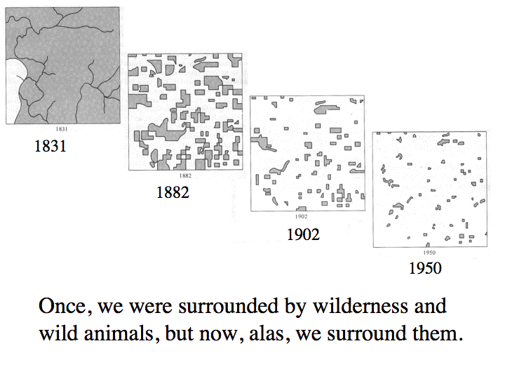 Changes in the landscape in Wisconsin from pre-settlement in 1831 over the course of a century plus. Fragmentation of the once extensive forest has led to many tiny islands of habitat.
