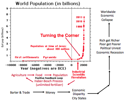 Spin Offs of Overpopulation © Eric R. Pianka Let's summarize the major consequences of overpopulation. As long as we were hunter-gatherers, human populations remained small for many millenia. Essentially, humans were limited by available food supplies. During good years, our populations increased but when conditions worsened, they decreased. Agriculture, invented about 100 centuries ago, allowed populations to increase because food leads population. As populations built up, cities were formed, and money was invented which made it possible for powerful people to exploit those less fortunate. During the first 10,000 years after the invention of agriculture, human populations climbed slowly to about 300 million at the time of Jesus (see graph). With the advent of the industrial-scientific revolution in the late 1700s and into the early 1800s, things changed rapidly -- machines were invented, agriculture benefited, food supplies increased and human populations thrived along with economic growth.