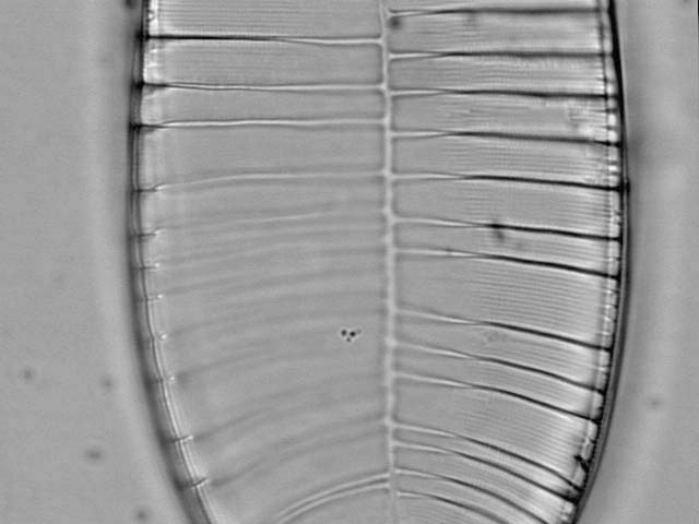 Second to last diatom; imaged with a 1.4 NA oil objective and a 1.4 NA oil condenser; this image was not made in class but by the instructor; the striations occur at a periodicity of approximately 300 nm, right at the limit of resolution of the light microscope