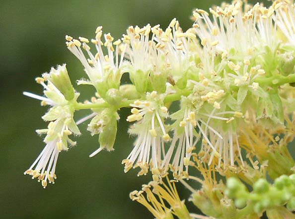 | cluster of inflorescences--mesquite is a mimosoid legume in which the receptacle is elongated such that it does not have the "pom-pon" inflorescence typical of other mimosoid legumes | part of an inflorescence closeup, showing individual flowers--notice that the stamens are the showiest part of these flowers |