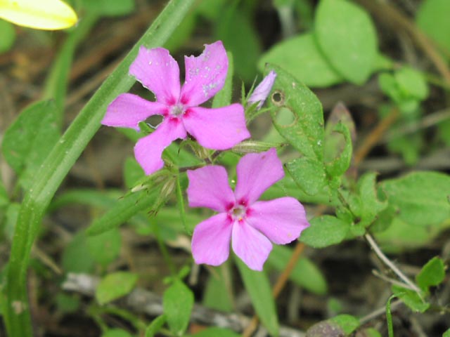 | flowers close up--how do these corollas differ from those of Phlox roemeriana? | flowers again, showing the characteristic violet spot at the base of each corolla lobe |