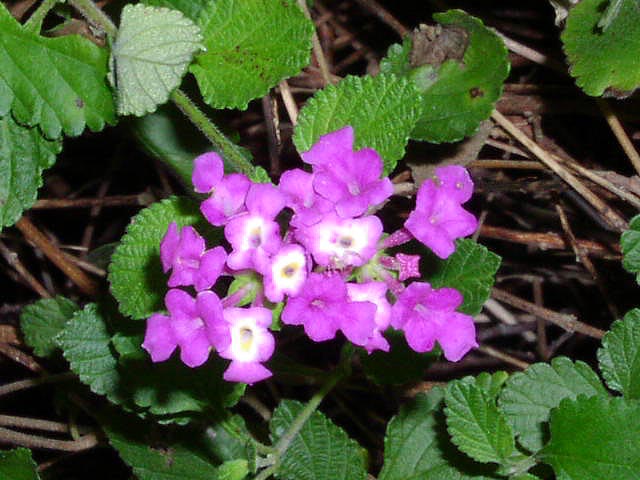 | inflorescence--in this species of Lantana, the centers of the flowers turn from white to purple as they age | leaves--what kind of venation and leaf margin are present here? These leaves are opposite and simple, as in our other species of Lantana. |