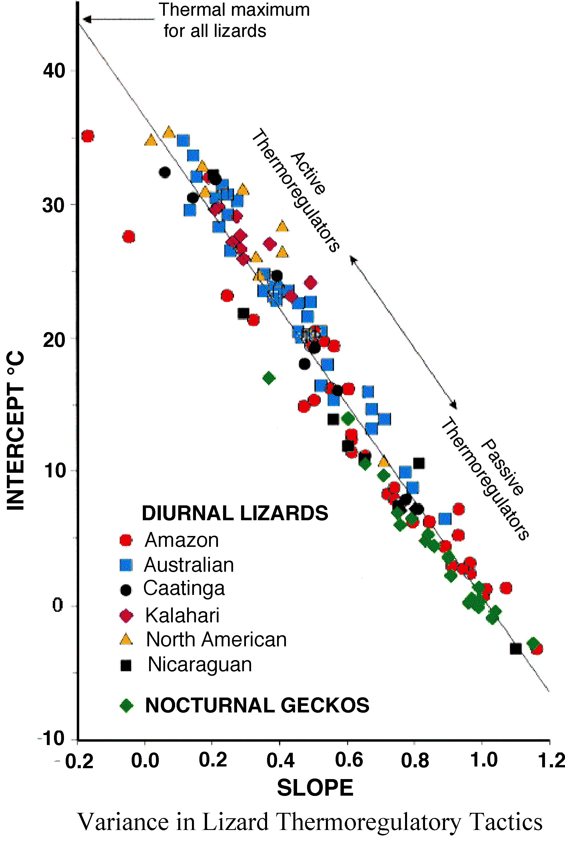 © Eric R. Pianka How organisms go about their daily activities and how they use their environments are of great interest to ecologists. The various ways in which organisms conform to the conditions imposed upon them by their surroundings are known as adaptations. All aspects of an animal's behavior are important -- natural history includes spatial and temporal patterns of activity, thermoregulation, foraging behavior, diet, courtship, mating, reproduction, as well as escape from predators. Use of Time and Space: Thermal RelationsAnimals that maintain relatively constant internal body temperatures are known as homeotherms, whereas those whose temperature varies widely from time to time, often approximating the temperature of their immediate environment, are called poikilotherms. A related pair of useful terms are sometimes confused with these two terms. An ectotherm obtains its heat from its external environment, whereas an endotherm produces most of its own heat internally by means of oxidative metabolism. All plants, and the vast majority of animals, are ectothermic; the only continuously endothermic animals are birds and mammals (some of these become ectothermic at times). Certain poikilotherms, including large snakes and large lizards, are at times at least partially endothermic, too. Many ectothermic lizards actually regulate their body temperatures very precisely during periods of activity by appropriate behavioral means, thus achieving a degree of homeothermy. An active desert lizard may have a body temperature every bit as high as that of a bird or mammal (the layperson's misleading terms "warm-blooded" and "cold-blooded" should be abandoned). Lizards constitute an extremely conspicuous element of the vertebrate faunas of most deserts, especially warmer ones. Indeed, the Australian mammalogist H. H. Finlayson (1943) referred to the vast interior deserts of Australia as "a land of lizards." Ectothermy facilitates metabolic inactivity, allowing lizards to capitalize on scant, unpredictable food supplies. Moreover, along with other ectotherms, lizards are low-energy animals. One day's food supply for a small bird will last a lizard of the same weight for a month or more. Ectothermy thus has distinct advantages over endothermy under the harsh and unpredictable conditions that prevail in deserts. By means of this thermal tactic, lizards can conserve water and energy by becoming inactive during the heat of midday, during resource shortages, or whenever difficult physical conditions occur (such as during heat waves or droughts). Birds and mammals must weather these inhospitable periods at a substantially higher metabolic cost. Hence ectothermy confers a competitive advantage on lizards over endotherms in desert environments. In temperate zones, hot arid regions typically support rich lizard faunas, whereas cooler forested areas have many fewer lizard species and individuals. Lizards can enjoy the benefits of a high metabolic rate during relatively brief periods when conditions are appropriate for activity, yet still become inactive during adverse conditions. By facilitating metabolic inactivity on both a daily and a seasonal basis, poikilothermy allows lizards to capitalize on unpredictable food supplies. Moreover, lizards can effectively reduce temporal heterogeneity by retreating underground, becoming inactive, and lowering their metabolic rate during harsh periods (some desert rodents estivate when food or water is in short supply). Poikilothermy may well contribute to the apparent relative success of lizards over birds and mammals in arid regions. Temperate zone forests and grasslands are probably too shady and too cold for ectothermic lizards to be very successful because these animals depend on basking to reach body temperatures high enough for activity; birds and mammals, in contrast, do quite well in such areas partly because of their endothermy. Lizards do well in warm tropical forests, however. A spectacular example of the capacity of lizards to go dormant took place in Arizona during the 1960s. An instant "Sun City" was built in the Sonoran desert. This small town had been in place for several years without appreciable rainfall, but the local residents had planted lawns and trees which were irrigated with ground water pumped up from the water table. When massive August rains finally fell, Gila monsters began popping up out of the ground in people's yards -- these lizards had been buried underground, inactive, living off the stored fat in their tails during the time that the city was being built. When averaged over a long enough period of time, the heat gained by an animal must be exactly balanced by the heat lost back to its environment; otherwise the animal would either warm up or cool off. Many different pathways of heat gains and heat losses exist. Balancing a heat budget requires very different adaptations under varying environmental conditions. At different times of day, ambient thermal conditions may change from being too cold to being too warm for a particular animal's optimal performance. Animals living in hot deserts must avoid overheating by being able to minimize heat loads and to dissipate heat efficiently; in contrast, those that live in colder places, such as at high altitudes and high latitudes, must be adept at acquiring, and retaining heat. Environmental temperatures fluctuate in characteristic ways at different places over the earth's surface, both daily and seasonally. In the absence of a long-term warming or cooling trend, environmental temperatures at any given place remain roughly constant when averaged over an entire annual cycle. The range in temperature within a year is much greater at high latitudes than it is nearer the equator. An animal could balance its annual heat budget by being entirely passive and simply allowing its temperature to mirror that of its environment. Such a passive thermoregulator is known as a thermoconformer. Of course, it is a