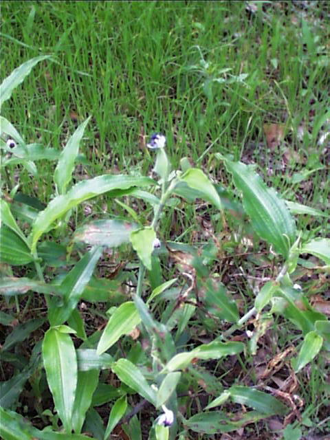 | flower yet again, but this time the third petal, which is white and much smaller than the two blue petals, is visible | habit and leaves--is this a monocot or a dicot? |